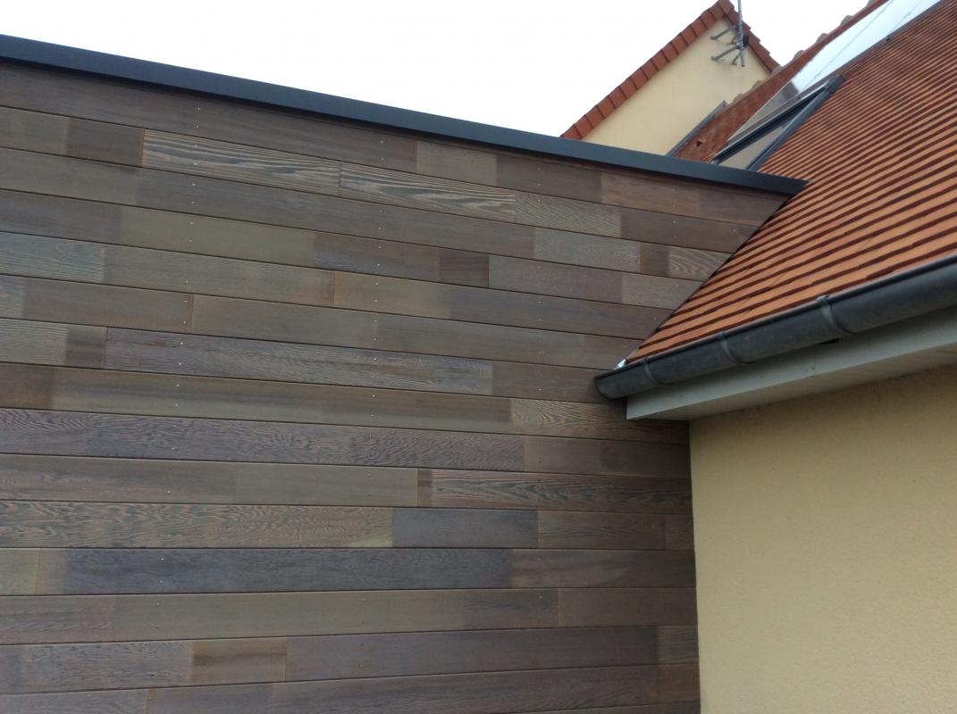 Pour cette extension, nous avons posé un bardage red cedar ne nécessitant aucun entretien et qui ne changera pas de teinte. Les menuiseries, quand à elles, sont en alu et le tout est surplombé par une toiture terrasse pour une pièce parfaitement isolé.