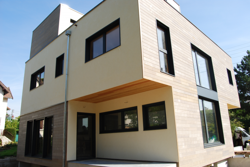 Maison trés contemporaine sur 3 étages avec mixte bardage red cedar et enduit